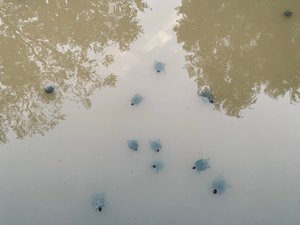 Crossing a bridge and stopping to see the turtles, who rush over in the muddy waters, hoping I’ll throw them a snack.