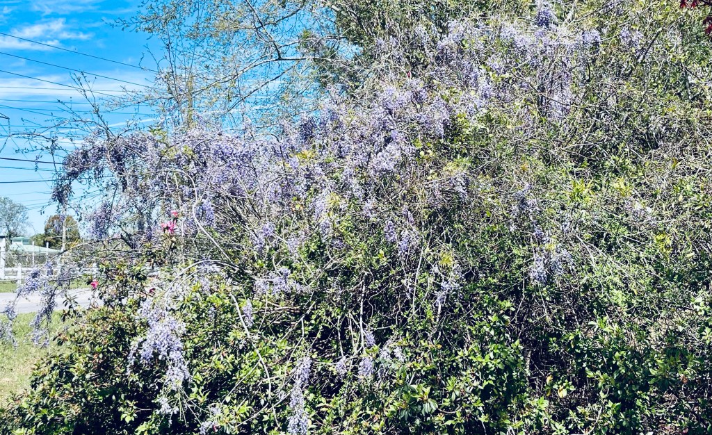 The front yard was somewhat overgrown from the months or years of abandonment, but evidence of a gardeners love was seen. Here, a giant wisteria, draping it’s lavender clusters of flowers next to the showy azaleas.