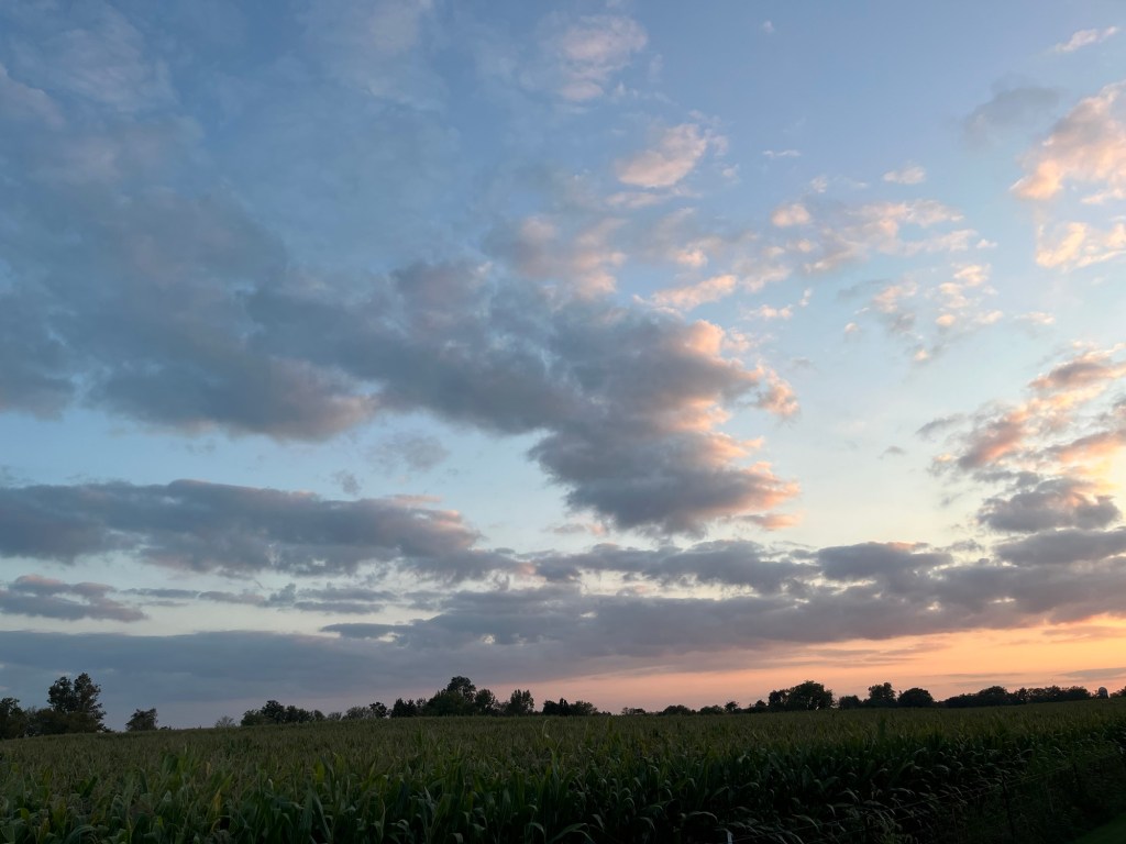 The field rustles, verdant against the pale blue of the late summer skies. The corn has already tassled, signaling the coming fade to brown that will herald harvest time.